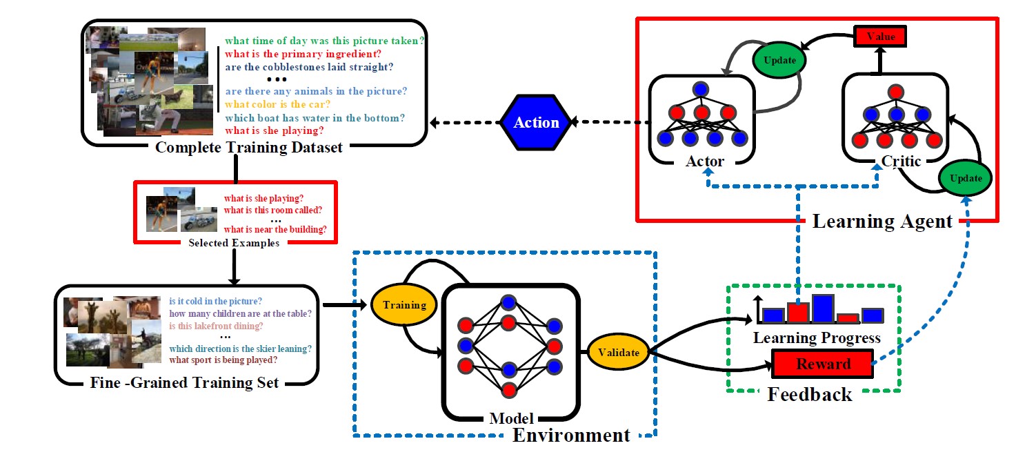 纪荣嵘教授团队的论文提出了一种基于强化学习的细粒度学习策略FG-A1C,旨在通过分析视觉问答任务中的样本多样性及标签的冗余性问题来针对性地挑选训练样本以提高模型的训练效率及减少标记支出。在该方法所提出的细粒度学习框架中,FG-A1C使用一个强化学习代理来自适应地评估模型训练状态、选择对应的训练样本类型,并使用基于主动学习或课程表学习的采样策略对该类型下的样本进行评估,以选择对模型训练帮助最为有效的训练样本。该算法在多个视觉问答数据集上获得优秀的训练效果,能够显著地降低模型训练成本以及标签成本。