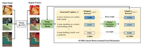 论文首先提出了基于度量导向的聚焦机制(Metric-oriented Focal Mechanism, MFM),用于图像描述任务中的难例样本挖掘。与现有的分类任务策略不同,MFM可以采用图像描述任务的生成性度量(如CIDEr, BLEU-N)来衡量样本的难度,然后在训练过程中提高难例样本的奖励权重。为了使MFM适用于不同的数据集和模型,并且无需繁琐的调参操作,我们进一步引入了一种称为有效CIDEr(ECIDEr)的自适应奖励指标,该指标在奖励估计过程中考虑了简单和困难示例的数据分布。我们在MS COCO数据集上进行了大量实验,结果表明,MFM在保持简单样本性能的同时,可以显著提高难例样本描述的生成质量。将基于ECIDEr的MFM应用在当前的SOTA方法上时,其性能优于所有现有方法,并在离线和在线测试中获得了最佳性能。