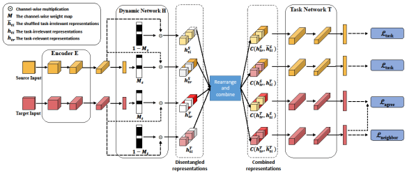 该论文旨在解决无监督领域适应中动态特征解耦表示问题。论文首先提出了无监督领域适应问题中“面向任务”的概念,接着提出了一个面向任务的动态特征解耦网络(DTDN)可以根据与任务的相关性概念,将特征解耦成“任务相关”和“任务无关”。其中,任务相关部分的特征同时具有任务有效性和领域无关性,而任务无关部分的特征则与之相反。通过该方法可以准确的将特征解耦,并利用同时具有有效性和领域无关性的任务相关特征完成无监督领域适应任务。该方法避免了手动设置参数的复杂度,在不需要生成模型或者解码器的情况下可以保留完整且有意义的信息,大大降低了训练成本。在多个领域适应数据集(行人重识别、车辆重识别、手写数字、办公图像数据集)上的实验结果证明了论文提出方法的有效性。