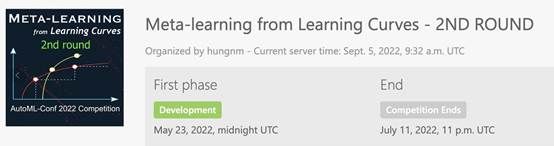 本次比赛是从学习曲线中元学习比赛的第二轮比赛,在首届AutoML Conference 2022上进行比赛结果的公布和汇报。本次比赛的组织者是:**Manh Hung Nguyen、Isabelle Guyon、Lisheng Sun-Hosoya 和 Nathan Grinsztajn**(法国巴黎萨克雷大学和 INRIA;以及美国 ChaLearn)。