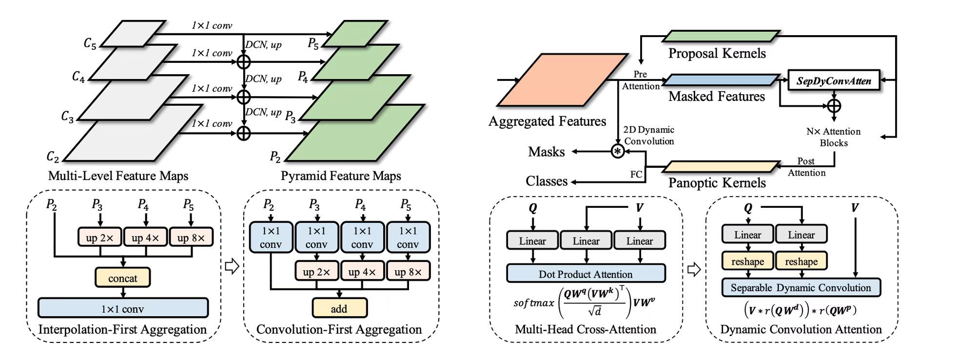文章提出了一种实时的全景分割方法,能通过统一的模型同时完成目标分类、检测、分类任务。为了提升整体模型的处理速度,文章分别提出了卷积优先特征聚合器与可分离动态卷积解码器。卷积优先特征聚合器通过调整卷积层与双线性差值的顺序,在理论精度完全等价的情况下实现模型的加速;可分离动态卷积解码器通过共享多头注意力机制中的全连接参数进行模型的加速。文章在常用的全景分割数据集MSCOCO、ADE20K、Cityscape以及Mapillary Vista上进行了相关实验,本文方法在速度超越其他基线模型的同时,达到了具有竞争力的准确性。
