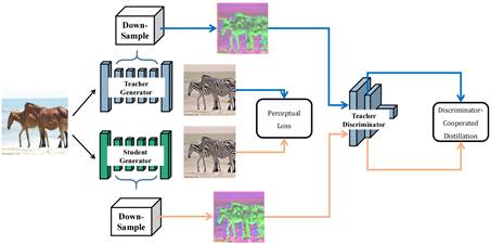 该论文针对生成对抗网络中的模型压缩问题,提出一种基于知识蒸馏的方法提升轻量化生成器的性能。论文提出基于鉴别器协作的知识蒸馏框架DCD,该方法考虑在蒸馏框架中,教师鉴别器可以作为现成的特征语义编码器,提炼出生成器中间特征图的有效信息进行蒸馏。为将生成器的特征图输入鉴别器中,对教师和学生网络分别定义两个不同的下采样模块,下采样模块均采用1×1卷积,其中教师的下采样模块初始化后不作更新,学生下采样模块随着训练更新参数。最后结合感知损失蒸馏以及教师鉴别器协作的生成对抗损失,在多个数据集(horse2zebra、summer2winter和edges2shoes)上实现了最佳性能。