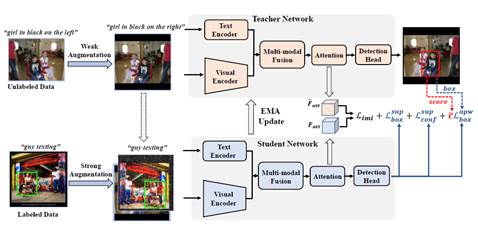 RefTeacher面向半监督指向性目标检测任务,提出了第一个半监督REC框架以降低标注成本。本文采用教师-学生网络框架,教师网络输入描述对象的图像和句子(无标签数据),输出文本所指向的伪边界框,与有标签数据一起用于训练学生网络,教师网络通过学生网络EMA更新。为了解决半监督REC任务中伪标签稀疏和错误率高的问题,RefTeacher包含两个专门设计的模块:基于注意力的模仿学习(AIL)和自适应伪标签加权(APW),以将知识从教师模型更好传递给学生模型。为了证明该模型的有效性,本文与多个基线比较并取得良好性能。
