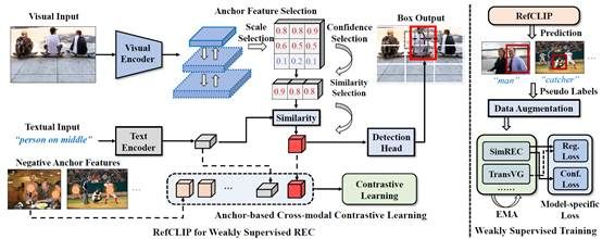 该论文面向弱监督指向性目标检测任务,即采用图像级别标注进行训练,根据指代表达式在图像中定位目标对象。现有方法采用两阶段流程,存在着速度和泛化性上的弊端。 针对以上问题,该论文首先提出了一种端到端的单阶段弱监督REC方法,称为RefCLIP。具体来说,RefCLIP将弱监督REC重新定义为锚点-文本匹配问题,可以避免现有方法中复杂的后处理。为了实现弱监督学习,该论文引入了基于锚点的对比损失,通过大量锚点-文本对进行优化训练。基于RefCLIP,该论文进一步提出了第一个针对现有REC模型的弱监督训练方案,即由RefCLIP为REC模型生成伪标签进行弱监督训练。通过精心设计,该方案甚至可以帮助现有REC模型实现比RefCLIP更好的弱监督性能。论文方法在在RefCOCO,RefCOCO+, RefCOCOg和ReferItGame数据集上进行了充分验证。相较于之前的方法,论文方法不仅将推理速度提高了5倍,而且显著提高了性能,例如在RefCOCO上提高了24.87%。