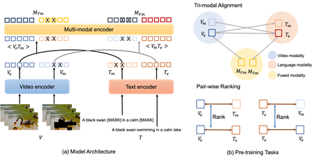 建立一个通用的视频语言预训练模型来解决各种视频理解任务,如视频文本检索和视频问题回答,是机器学习领域的一个开放性挑战,现有方法通常存在泛化性差以及推理效率低的问题。为了解决上述问题,本文提出了一种统一的视频语言预训练模型Clover,Clover通过结合视频文本检索中常用的双塔模型和视频问答任务中常用的融合模型并在下游任务拆分使用来解决在多类下游任务泛化性差的问题,同时,Clover通过一个新的三模态对齐的预训练任务来协同提升模型跨模态对齐和跨模态融合的能力,使融合模型可以通过梯度回传以外的方式直接影响单模态编码器。此外,Clover通过纳入对语义增强的MLM预训练任务和配对排序预训练任务来加强三模态对齐的效果,提升模型的准确性和鲁棒性。实验证明,本文提出的Clover预训练模型在多个下游任务数据集上达到了当前的SOTA,包括了三个视频文本检索数据集和八个视频问答数据集。
