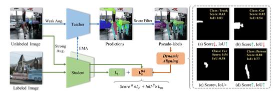 该论文面向半监督实例分割任务,针对现有方法的一个局限性,即伪标签的类别和掩模质量的不匹配问题,提出了一种新颖的框架,称为PAIS。在PAIS中,我们设计了一种动态对齐损失函数(DALoss),它可以调整具有不同类别和掩模分数对的半监督损失函数项的权重,以此来缓解不匹配的问题。通过在COCO 和 Cityscapes 数据集上进行的广泛实验,我们证明 PAIS 是半监督实例分割的一个有效的框架,特别是在标记数据严重有限的情况下。