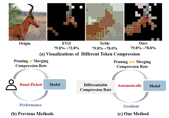 令牌压缩旨在通过修剪(丢弃)或合并令牌来加速大规模视觉变换器(例如ViTs)。这是一项重要而具有挑战性的任务。虽然最近的先进方法取得了巨大的成功,但它们需要精心制定压缩率(即要删除的令牌数量),这是一项繁琐的工作,并导致次优的性能。为了解决这个问题,我们提出了可微分压缩率(DiffRate),这是一种具有几个吸引人的特性的新型令牌压缩方法。首先,DiffRate能够将损失函数的梯度传播到压缩率上,而在以前的工作中,压缩率被视为不可微分的超参数。在这种情况下,不同的层可以自动学习不同的压缩率,无需额外的开销。其次,在DiffRate中,令牌修剪和合并可以自然地同时进行,而在以前的工作中它们是独立的。第三,广泛的实验证明DiffRate实现了最先进的性能。例如,将学习到的逐层压缩率应用于现成的ViT-H(MAE)模型,我们在ImageNet上实现了40%的FLOPs减少和1.5倍的吞吐量提高,而准确率仅下降了0.16%,甚至优于以前的经过微调的方法。