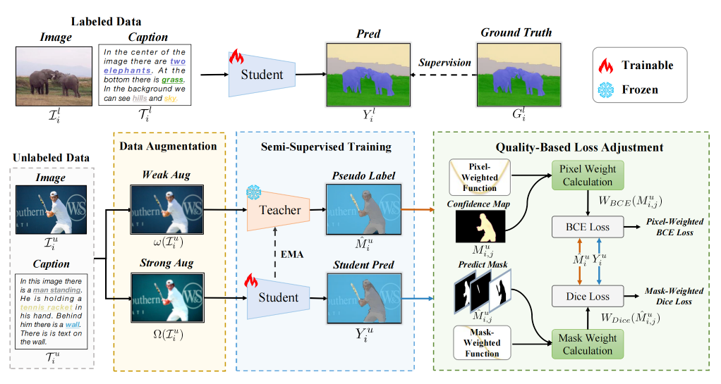 全景叙事定位(PNG)任务需要相对昂贵的像素级标注,这限制了该任务的推广落地。本文提出一个新的任务设定——半监督全景叙事分割(SS-PNG),只需少量的图文对和分割标注,即可完成高效的PNG模型训练,减小了对标注数据的依赖。具体而言,本文采用教师-学生网络架构搭建了SS-PNG-NW网络,探索了Burn-In策略和各种数据增强技术来确定最优设置。针对训练过程中不同样本的伪标签质量存在差异的问题,本文进一步提出了基于伪标签质量的损失函数调整方法,并基于此构建了SS-PNG-NW+网络,以更好地让高质量伪标签指导学生模型学习。基于PNG数据集的各类消融实验验证了所提出方法的有效性。在仅使用30%的标签数据时,所提出的半监督网络甚至可超过全监督模型。