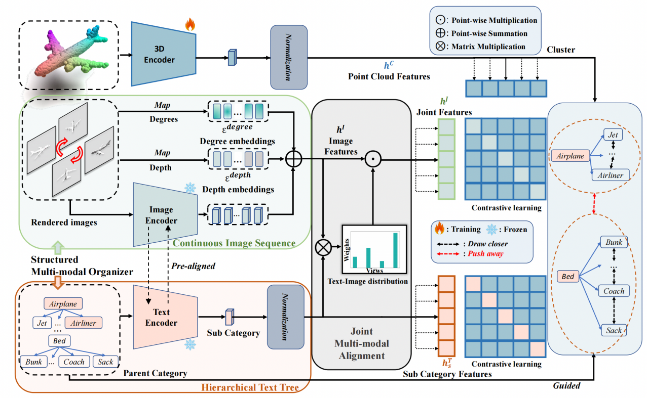 本文横跨3D、文本和图像多个模态,旨在构建3D到自然语言的表征学习与训练框架。近年来,3D表示学习已逐步引入2D视觉-语言预训练模型,以克服数据稀缺的挑战。然而,现有方法仅仅是将2D对齐策略简单地转移到3D表示上,导致了信息退化和协同不足的瓶颈。本文提出了一种名为JM3D的多视角联合模态建模框架,以获得3D点云、文本和图像的统一表示。在数据组织上,本文提出了一种新颖的结构化多模态组织器(SMO),引入了连续随机采样多视角图像和层次化文本以丰富视觉和语言模态的表示,进而解决信息退化问题。同时,本文设计了一种联合多模态对齐(JMA)来解决协同上的不足,并给出了相关的理论推导和原理解释,实现了点云-图片-文本多模态的统一表征。相关代码和数据已在https://github.com/Mr-Neko/JM3D开源。