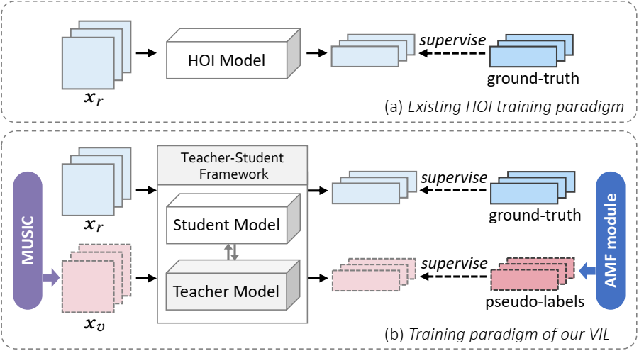 人-物交互(HOI)检测旨在定位图像中具有交互性的人与物体,并识别两者间的交互关系。HOI的性能受限于严重的长尾问题,为缓解长尾问题,本文提出了模型无关的增益方法——VIL(Virtual Image Learning)。首先,本文设计了名为MUSIC的数据生成法,通过向朴素文本提示添加特定描述生成图像,并采用多环节过滤过程,构造与真实数据集同分布的虚拟数据集。之后,训练时引入教师-学生网络框架。为提升伪标签的质量,本文提出了AMF模块,自适应地对伪标签进行匹配与筛选。最后,本文在HOI常用的两大数据集上与多个现有方法结合,性能的提升证明了本文方法的有效性。