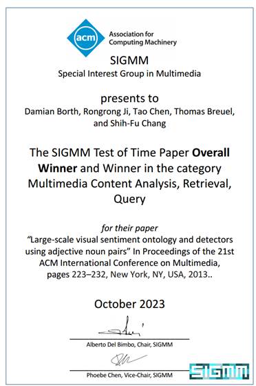 纪荣嵘教授发表于ACM Multimedia(MM ‘13)的论文 “Large-scale visual sentiment ontology and detectors using adjective noun pairs.”,荣获 2023年度SIGMM Test of Time Paper Award。