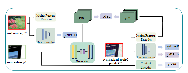 本文提出了一种弱监督图像去摩尔纹的方法(UnDeM)。与大量依赖于从成对的真实数据中学习的现有研究不同,该方法试图从未配对的真实数据(即与不相关的干净图像相关的莫尔图像)中学习去摩尔纹模型。首先将真实的摩尔纹图像划分为块,并根据其摩尔纹复杂度对其进行分组,接着引入了一种新的摩尔纹生成框架以合成具有不同摩尔纹特征的莫尔图像,生成的图像的伪摩尔纹类似于真实的摩尔纹,生成的图像的细节类似于真实无摩尔纹图像的细节。此外,本文还引入了一种自适应去噪方法来消除对模型学习产生不利影响的低质量伪摩尔纹图像。在常用的FHDMi和UHDM数据集上进行的实验结果表明,当使用现有的去摩尔纹模型(如MBCNN和ESDNet-L)时,本文提出的UnDeM方法性能更好。