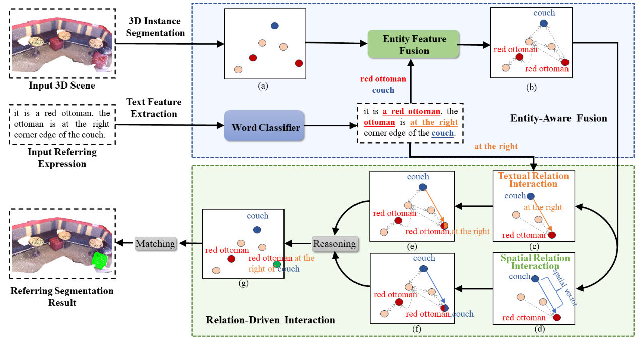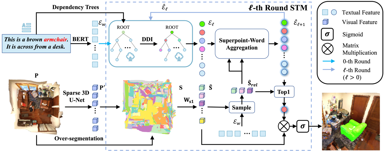 本文提出了一种用于解决3D指向性分割任务 (3D-RES)的端到端超点文本匹配网络 (3D-STMN)。这是一种全新的单阶段范式,在性能和速度上都大幅优于之前的双阶段范式。为了解决双阶段范式受限于第一阶段分割不准确以及实例缺失的问题,本文引入了一种新的超点文本匹配机制,利用超点文本特征的聚合来获取目标实例的掩码。为了从文本角度增强语义解析,本文引入了一个基于依存树的依赖驱动交互模块,实现了令牌级交互。该模块利用来自依存语法树的先验信息来引导文本信息的流动。相关代码和数据已在https://github.com/sosppxo/3D-STMN上开源。