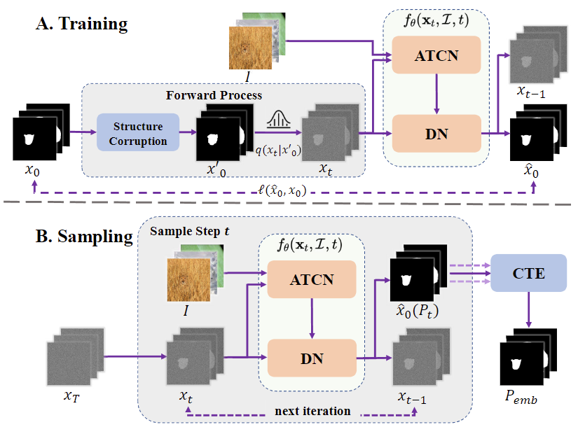 本文提出了一种基于扩散模型的伪装目标检测方法(CamoDiffusion)。该方法解决了伪装目标检测中伪装对象边界混淆和过度自信的错误预测问题。首先,从标准正态分布中采样的噪声图像被用作初始分割预测。然后,通过提出的自适应Transformer条件网络动态提取图像特征,并结合多尺度机制将粗粒度到细粒度的特征进行全面融合,得到伪装图像特征。接下来,去噪网络结合所提取的特征,从初始噪声掩膜开始,结合多尺度特征和时间步,输出细化后的分割图像。去噪扩散模型的训练使用了交并比损失和二元交叉熵损失。在测试阶段,通过重复去噪操作,得到一个精细的特征图。此外,本研究还设计了一种新的加噪策略(对轮廓进行破坏),引入了结构级别的噪声,并提出了新的融合策略,以有效利用不同时间步的预测结果。实验结果表明,与其他伪装目标检测模型相比,本文的模型取得了更好的效果。