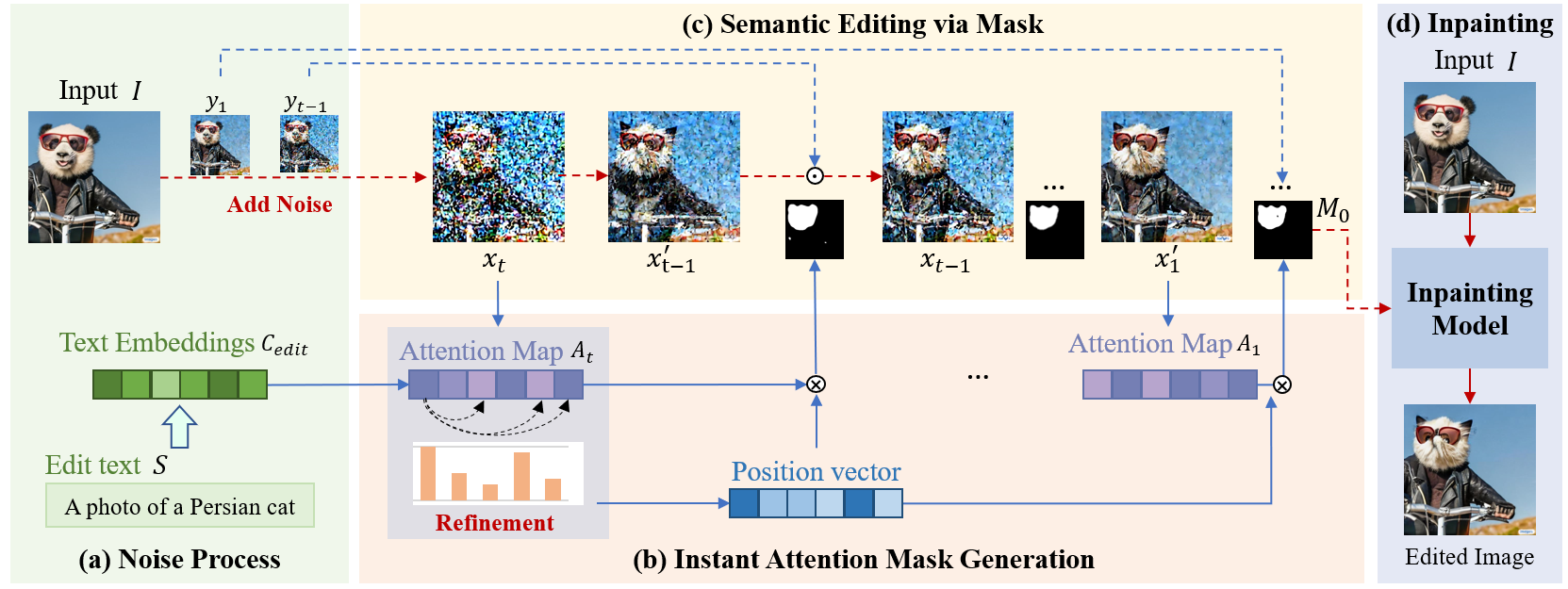 本文提出了一种用于文本到图像(Text to Image, T2I)扩散模型的免训练、即插即用图像编辑方法,称为即时扩散编辑(InstDiffEdit)。该方法旨在解决扩散模型在利用掩码进行局部编辑任务时的效率低、精度差的问题。具体来说,InstDiffEdit 利用现有扩散模型的跨模式注意能力,在扩散步骤中实现即时的掩模引导。此外,本文还为 InstDiffEdit 配备了免训练的解决方案,通过自适应地聚合注意力分布,实现自动且准确的即时掩模生成。最后,为了充实基于扩散的图像编辑(DIE)评估体系,本文提出了一个名为Editing-Mask的新基准来度量现有编辑方法的掩模准确性和局部编辑能力。在ImageNet和Image数据集上的实验结果验证了本文方法在效率以及精度上的有效性。