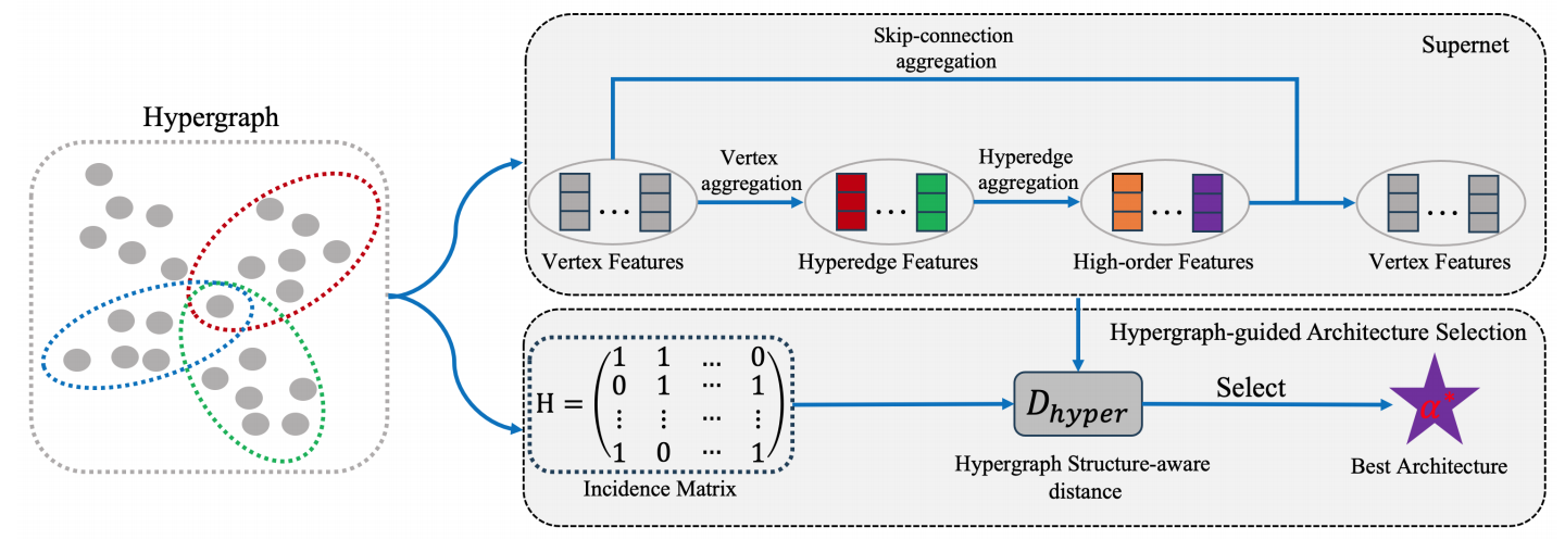 近年来,超图神经网络在处理非欧数据中引起了广泛的关注。然而,现有超图神经网络需要研究人员手动调整各种复杂的模型参数,耗费了大量人力和计算资源。为了解决这个问题,本文提出一种超图神经架构搜索方法,能够自动化整个超图神经网络的构建过程。具体来说,定义了一个适用于超图神经网络的搜索空间,然后采用可微的神经架构搜索策略自动寻找适合下游学习任务的超图神经网络架构。在引文网络数据集和超图数据集上的实验表明本文模型优于现有的超图神经网络模型。