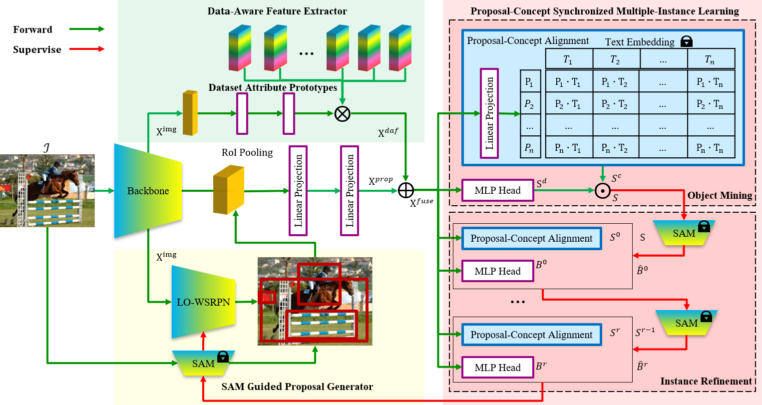 本文提出了一种新型的弱监督开放词汇目标检测框架WSOVOD,利用仅包含图像级注释的多样化数据集来扩展传统的弱监督目标检测框架(WSOD)来检测新颖目标。本文探索了三种关键策略,包括数据特征适应、图像显著目标定位和区域视觉语言对齐。首先,进行数据感知特征提取,生成输入条件系数,该系数被利用到组合数据集属性原型中以识别数据集偏差并帮助实现跨数据集泛化。其次,提出了一个自定义的位置导向弱监督区域提议网络,利用类别无关的分割模型的语义布局来区分对象边界。最后,引入了一个提案概念同步的多实例网络,即对象挖掘和视觉语义对齐的细化,以发现与概念的文本嵌入匹配的对象。在Pascal VOC和MS COCO上的大量实验表明,与先前的WSOD方法相比,WSOVOD在封闭集对象定位和检测任务中实现了新的最先进性能。同时,WSOVOD实现了跨数据集和开放词汇表学习以实现与全监督SOTA开放词汇表对象检测(FSOVOD)相当或更好的性能。