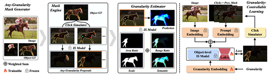 本文介绍了一种新颖的交互式分割方法,称为Granularity-Controllable Interactive Segmentation(GraCo),它通过引入额外的输入参数来实现对预测粒度的精确控制,从而增强了交互系统的定制化,并在解决模糊性的同时消除了冗余。现有的交互式分割(IS)流程分为两类:单粒度输出和多粒度输出。后者旨在缓解前者中存在的空间模糊性。然而,多粒度输出流程的交互灵活性有限,且会产生冗余结果。尽管如此,注释多粒度掩膜的高昂成本以及缺乏具有粒度注释的可用数据集,使得模型难以获得控制输出粒度所需的指导。为了解决这个问题,本文设计了一个任意粒度掩膜生成器,利用预训练IS模型的语义属性自动生成大量的掩膜-粒度对,而无需额外的手动注释。基于这些对,本文提出了一种粒度可控的学习策略,有效地将粒度可控性赋予IS模型。在复杂的对象和部分级别场景的广泛实验中,本文的GraCo与以往的方法相比显示出显著优势。这突显了GraCo成为一个灵活的注释工具的潜力,能够适应多样的分割场景。