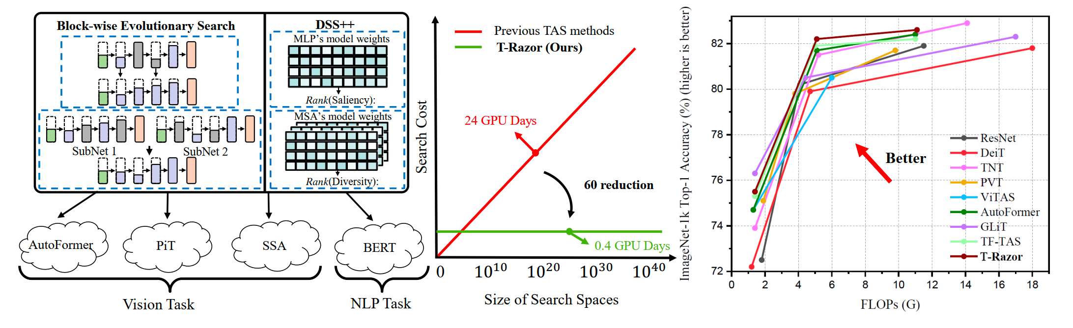 该论文提出了一种高效的Transformer结构搜索方法(T-Razor),采用零代价代理引导的进化算法来加速Transformer结构搜索的效率。T-Razor基于Transformer结构的多头注意力模块(MSA)和多层感知机模块(MLP)的多样性和显著性排序情况构建了面向Transformer结构的零代价代理指标,称为DSS++。通过利用MSA模块的多样性排序和MLP模块的显著性排序,T-Razor有效地估计了给定搜索空间中不同Transformer结构之间的相对性能排序。该论文中还提出了一种与DSS++结合的模块级进化搜索方法,进一步提高搜索效率并改善搜索结果。与其他主流的Transformer结构搜索方法相比,由DSS++指导的模块级进化搜索在涉及视觉任务和自然语言处理(NLP)任务的复杂Transformer搜索空间中实现了有竞争力的性能。此外,T-Razor显著提高了Transformer结构搜索的效率,仅需约0.4 个GPU天数即可实现对相对最优的Transformer结构的搜索。