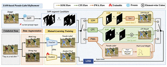 指向性目标分割(RES)任务旨在给定文本提示下,在图像上分割出文本指向的目标实例。为了解决传统全监督训练范式需要大量分割掩码而引发的标注难题,本文提出半监督RES训练框架SemiRES,有效地利用少部分有标注数据和大量易获得无标数据。在缺乏数据的前提下,半监督框架中教师模型生成的伪标签常常存在有噪声、欠分割、过分割现象,特别是在实例对象边界处细节有所缺失。为了解决这一问题,SemiRES巧妙地使用了以精确边界标注而闻名的Segment Anything Model(SAM)以提高粗糙伪标签的质量。具体地,本文提出了两种匹配策略:最优匹配策略策略(IOM)和合成策略(CPI),旨在从SAM的输出中提取最准确的掩码去优化伪标签,从而进一步引导学生模型的训练。此外,在SAM没有匹配出合适的掩码时,本文设计了像素级调整(PWA)策略,根据伪标签的置信水平对损失函数进行逐像素调整。SemiRES在三个RES基准测试集RefCOCO、RefCOCO+和G-Ref上的广泛实验表明其有效性。特别地,仅使用1%的标记数据,SemiRES在RefCOCO val集上,相对同等标注数据的有监督基线模型提升了18.64%。