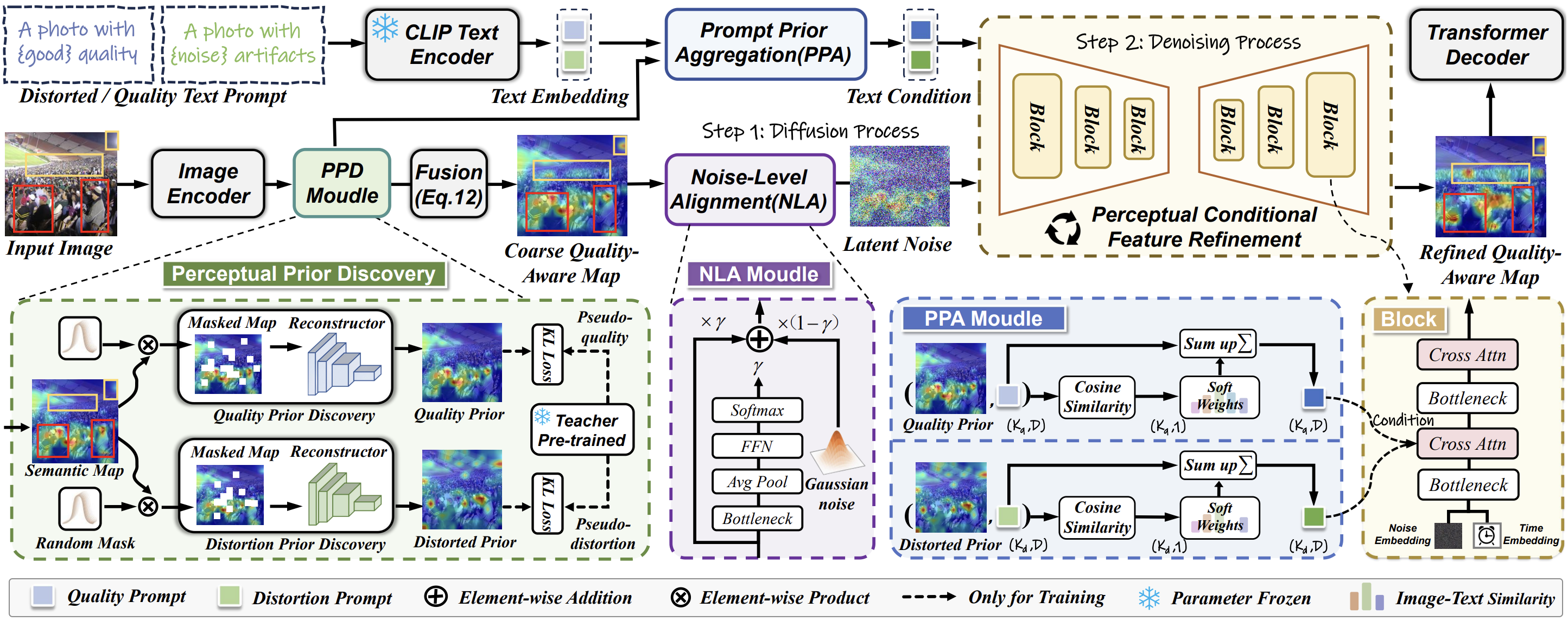 简介:盲图像质量评价(BIQA)旨在在没有参考基准的情况下,对图像质量进行符合人类感知的评价。目前,深度学习BIQA方法通常依赖于使用来自高层任务的特征进行迁移学习。然而,BIQA与这些高级任务之间的固有差异不可避免地将噪声引入到质量感知特征中。本文初步探索了BIQA任务中用于特征去噪的扩散模型,即感知特征扩散IQA方法(PFD-IQA),旨在从质量感知特征中去除噪声。具体来说,1)提出一种感知先验发现和聚合模块,建立两个辅助任务,以发现图像中潜在的低层特征,用于为扩散模型聚合质量感知的文本条件。2)提出一种感知条件特征细化策略,将噪声特征与预定义的去噪轨迹进行匹配,然后基于质量感知的文本条件进行精确的特征去噪。通过合并一个轻量级去噪器,并且只需要几个特征去噪步骤,所提出方法在多个标准BIQA数据集上表现出优越的性能。