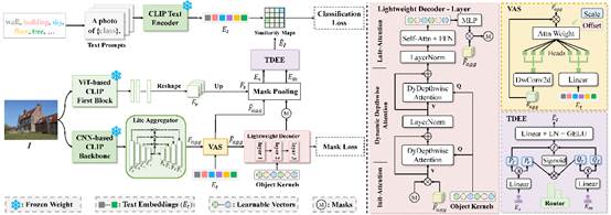简介:开放词汇全景分割旨在对任意词汇表中不同场景的所有物体进行分割。现有方法中两阶段框架通常使用掩码生成器生成的掩码多次裁剪图像,然后进行特征提取,而单阶段框架依靠重量级掩码解码器通过多个堆叠的 Transformer 块中的自注意力和交叉注意力来弥补空间位置信息的不足。这两种方法都会产生大量的计算开销,从而阻碍模型推理的效率。为了填补效率方面的空白,本文提出了一种新颖的单阶段、共享、高效的框架,并引入两个将基线提升到强大的EOV-Seg框架的优雅设计。首先,本文提出了一个词汇感知选择模块来提高对视觉聚合特征的语义理解并减轻掩码解码器上的特征交互负担。其次,本文引入了双向动态嵌入专家,它有效地利用了基于 ViT 的 CLIP 主干网络的空间感知能力,使用权重分配路由器动态分配嵌入专家权重,以生成具有语义感知和空间感知的实例嵌入,用于掩码识别。据我们所知,EOV-Seg 是第一个面向效率的开放词汇全景分割框架,与最先进的方法相比,它运行速度更快,性能更具竞争力,实现了速度与性能的最佳权衡。