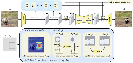 简介:当前常采用反演、重建和编辑的三分支结构的方法来解决一致的图像编辑任务。然而,这些方法缺乏对编辑对象的生成位置的控制,并且在背景保持方面存在问题。为了克服这些限制,本文提出了一种只有反演和编辑两个分支的免微调方法。该方法允许用户同时编辑对象的动作并控制编辑对象的生成位置。此外,本文还实现了更优的背景保持,即在反演过程中的特定时间步将被编辑对象的信息传输到目标区域并修复或保持其他区域的背景。编辑阶段,在自注意力机制中使用图像特征来查询反演过程中对应时间步的键和值,以实现一致的图像编辑。定性的图像编辑结果和定量的评估实验证明了本文方法的有效性。