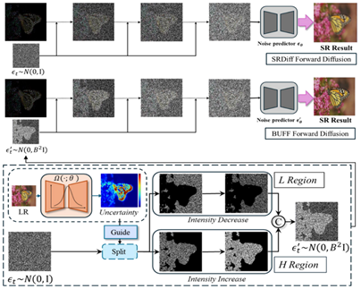 简介:超分辨率(SR)技术对于提高图像质量至关重要,尤其是在需要高分辨率图像但又受到硬件限制的情况下。现有的超分辨率扩散模型主要依赖高斯模型来生成噪声,但在处理自然场景中固有的复杂多变的噪声时,高斯模型往往显得力不从心。为了解决这些不足,本文引入了贝叶斯不确定性引导扩散概率模型(BUFF)。BUFF 的与众不同之处在于它结合了贝叶斯网络来生成高分辨率的不确定性掩码。这些掩码为扩散过程提供指导,允许以一种上下文感知和自适应的方式调整噪声强度。这种新颖的方法不仅提高了超分辨图像与原始高分辨率图像的保真度,还显著减少了以复杂纹理和精细细节为特征的区域的伪影和模糊。该模型对复杂噪声模式表现出卓越的鲁棒性,并在处理图像中的纹理和边缘方面展现出超强的适应性。由视觉结果支持的经验证据说明了该模型的鲁棒性,尤其是在具有挑战性的场景中,以及在解决模糊等常见 SR 问题方面的有效性。在 DIV2K 数据集上进行的实验评估显示,BUFF 实现了显著的改进,在 BSD100 上的 SSIM 与基线相比提高了 +0.61,超过了传统的扩散方法,平均多提高了 +0.20dB PSNR。这些发现强调了贝叶斯方法在增强 SR 扩散过程中的潜力,为该领域未来的发展铺平了道路。