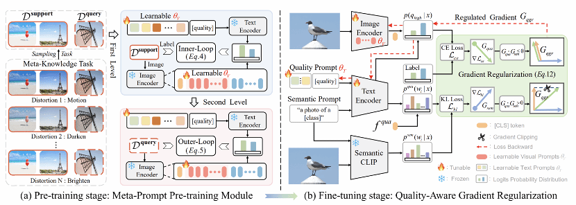 简介:图像质量评估(Image Quality Assessment, IQA)因其复杂的失真条件、多样的图像内容以及有限的可用数据,至今仍是计算机视觉领域一个尚未解决的挑战。现有的盲IQA (BIQA)方法严重依赖广泛的人工标注来训练模型,由于创建IQA数据集的要求高,这是劳动密集型和成本高昂的。为了减轻对标记样本的依赖,本文提出了一种梯度调节元提示IQA框架(GRMP-IQA)。该框架旨在将强大的视觉-语言预训练模型CLIP快速迁移至下游IQA任务,显著提高在数据有限的场景下的准确性。GRMP-IQA包括两个关键模块:元提示预训练模块和质量感知梯度正则化。前者利用元学习范式对软提示进行预训练,使其学习跨不同失真类型的共享元知识,从而实现对各类IQA任务的快速适应;后者则在目标任务微调过程中调整更新梯度,引导模型聚焦于质量相关的特征,以防止对图像的语义信息产生过拟合。实验结果表明,GRMP-IQA在少样本设定下表现优异。此外,仅用20%的训练数据,其表现即可超越大多数现有的全监督BIQA方法。