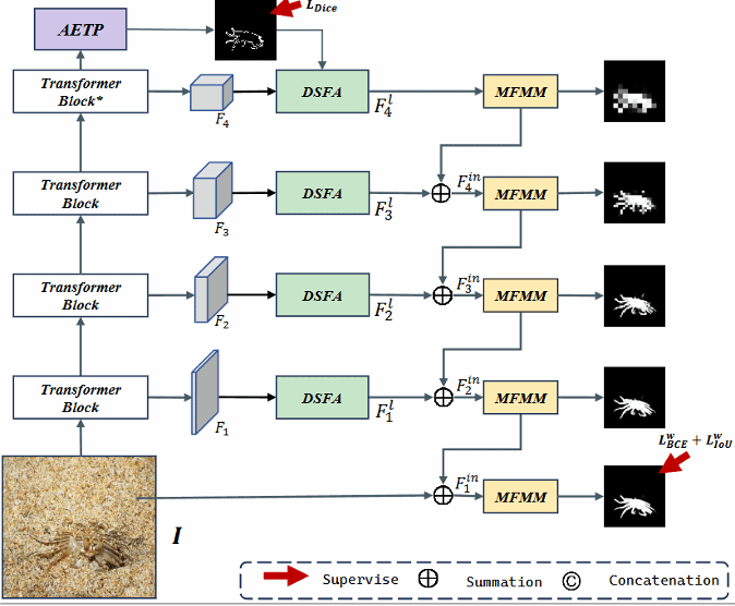 简介:针对伪装目标检测(COD)中目标与背景纹理高度相似导致边界本质模糊,以及现有各种特征方法因边界约束不足常产生断断续续预测的问题,本文提出了具备动态耦合边缘-纹理感知能力的ESCNet框架。该框架的核心创新在于三个协同工作的组件:自适应边缘-纹理感知器(AETP),其融合Transformer全局语义的图像多尺度特征,创建了边缘与纹理信息相互协同引导的边缘预测机制;双流特征增强器(DSFA)则依据局部纹理复杂度和边缘方向动态调整核采样位置,精准强化不规则边界和非定型纹理区域的特征信息;多特征调制模块(MFMM)通过增强边缘感知表征及层级融合多种纹理,为特征校准与模型预测建立了渐进细化的优化过程。这些组件相互关联构成一个闭环反馈系统,增强的边缘感知提升纹理预测,而优化的纹理信息亦反哺边缘感知。在三大权威数据集上的实验充分验证了ESCNet的显著性能优势。
