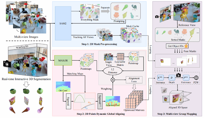 简介:基于二维图像的交互式三维分割技术最近展现了令人印象深刻的性能。然而,当前的模型通常需要大量针对特定场景的训练才能准确地重建和分割物体,这限制了它们在实时场景中的适用性。本文提出一种前馈的交互式分割方法(WildSeg3D),能够在不同的环境中分割任意三维物体。这种前馈方法的一个关键挑战在于跨多个二维视图的三维对齐误差的累积,这会导致三维分割结果不准确。为了解决这个问题,本文提出了动态全局对齐 (DGA) 技术,通过使用动态调整函数来专注于图像中难以匹配的三维点,从而提高全局多视图对齐的准确性。此外,为了实现实时交互式分割,本文还引入了多视图组映射 (MGM) 方法,该方法利用对象掩码缓存来集成多视图分割并快速响应用户提示。WildSeg3D 展现了跨任意场景的泛化能力,无需针对特定场景进行训练,与现有 SOTA 模型相比,在保证精度的前提下,很大提升了整体速度。