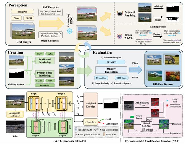 随着生成式人工智能图像工具的迅速发展,基于AI的图像局部编辑日益逼真,给验证视觉内容完整性带来了新的挑战。目前检测数据集的局限在于过于关注物体(object-centric)伪造,而忽略了天空、地面等场景级元素(stuff and background),导致检测模型泛化能力不足。本文提出 BR-Gen——一个包含 150,000 张AI局部编辑图像的大规模数据集,具有多种场景感知标注。BR-Gen 通过全自动的“感知—生成—评估”流程构建,以确保语义一致性与视觉真实感。本文进一步提出 NFA-ViT——一种噪声引导的伪造增强方法,其能提升局部伪造检测能力。NFA-ViT 利用噪声指纹挖掘图像区域中的差异来源,并强制正常特征与异常特征交互,使伪造痕迹在整幅图像中传播,令细微伪造能够影响更广的上下文,从而提升模型检测的鲁棒性。大量实验表明,BR-Gen 构建了现有方法未覆盖的全新场景;NFA-ViT 在 BR-Gen 上超越现有方法,并在多个现有基准上表现出良好的泛化能力。项目代码可参见:https://github.com/clpbc/BR-Gen。