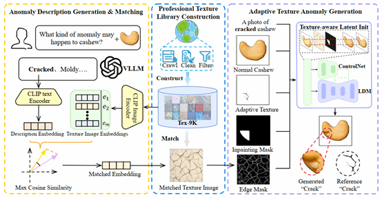视觉异常检测由于缺乏足够的异常数据而受到限制。尽管现有的异常合成方法已经取得了显著进展,但在同时兼顾合成结果的真实感和多样性方面仍面临巨大挑战。为了解决这一问题,本文提出了 AnomalyPainter框架,这一新框架通过协同利用视觉语言大模型、潜在扩散模型以及本文新构建的纹理库 Tex-9K,打破“多样性–真实感”的权衡困境。Tex-9K 是一个专业纹理库,包含 75 个类别、共 8792 个纹理素材,专门为多样化异常合成而设计。借助 VLLM 的通用知识,本文为每一种工业目标自动生成合理的异常文本描述,并与 Tex-9K 中相关且多样的纹理进行匹配;这些纹理随后通过 ControlNet 引导 LDM 在正常图像上进行“绘制”。大量实验表明,AnomalyPainter 在真实感、多样性和泛化能力方面均优于现有方法,并在下游任务中取得了更好的性能。
