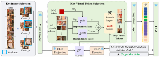 本文提出了一个名为 KTV的免训练的视频理解框架,通过“两级筛选”让通用图像-文本大模型更高效地看视频:第一步,它不用问题信息,而是用 DINOv2 提取所有帧的特征并做 K-means 聚类,从中选出能代表整段视频、且内容多样的问题无关关键帧以避免落入“语义陷阱”,从而减少时间上的冗余;第二步,在每个关键帧内,再根据与[CLS] token的重要性得分和与其他视觉token的冗余度共同计算评分,只保留最有信息量、又不过于重复的关键视觉 token,并结合CLIP评估与问题的相关性,为更相关的帧分配更多token,最终将这些精简后的视觉token与文本一起输入LLaVA等VLM进行推理。实验表明,在多项多选视频问答基准上,KTV在仅用极少视觉token(例如60分钟、10800帧的视频只用 504 个视觉 token)的情况下,仍优于现有免训练的视频理解方法,部分设置甚至超过一些需要专门训练的视频大模型,显著降低了推理时长和算力需求。