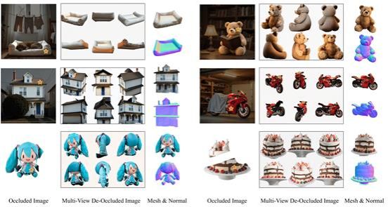 本文提出DeOcc-1-to-3,首个支持从遮挡图像直接进行3D补全与重建的端到端方法。该框架基于预训练多视角扩散模型,通过结构保持的自蒸馏训练策略,联合学习图像补全与多视角合成,无需修改原始架构即可获得高质量、结构一致的新视图,显著提升遮挡场景下的3D重建效果。此外,本文还构建了首个系统性遮挡三维重建评测基准Occ-LVIS,涵盖多类别与多等级遮挡,支持细粒度评估。实验证明,DeOcc-1-to-3在重建完整性与视觉质量方面均优于两阶段方法,同时具备良好的推理效率与泛化能力。