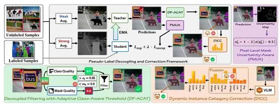 半监督实例分割(SSIS)旨在利用有限的标注数据与大规模未标注数据实现实例级预测,但其性能高度依赖伪标签质量。现有方法通常将类别置信度与掩码质量耦合为单一分数进行过滤,容易造成语义准确性与空间精度之间的冲突,从而引入噪声伪标签并限制模型上限。